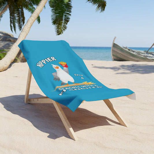Happier Than A Seagull with a French Fry Beach Towel